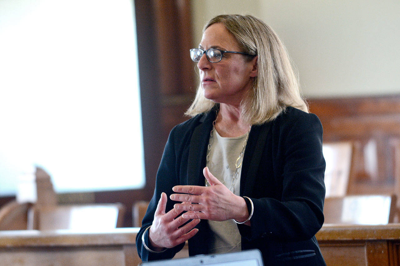 Patricia Charnas, director of the county Department of Community Development, discusses the draft development agreement for a resort near Brinnon on Tuesday. (Jesse Major/Peninsula Daily News)