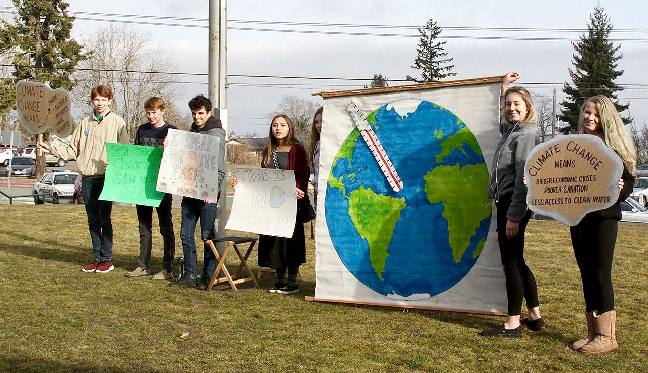 PORT ANGELES — About 25 Port Angeles High School students left classes to carry signs and banners and call attention to climate change.