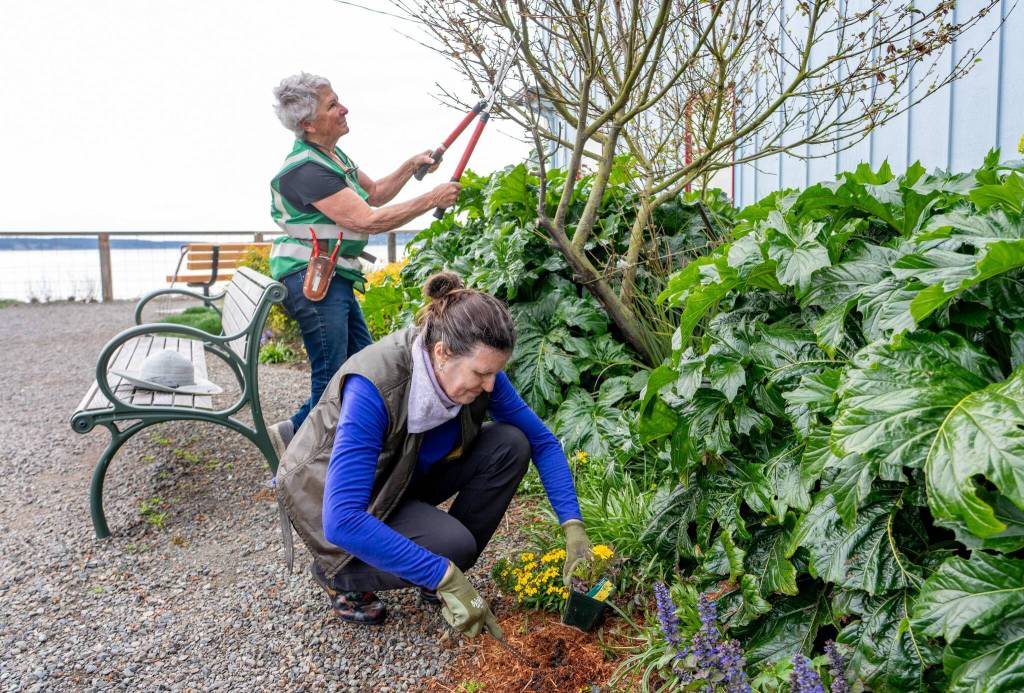 Port Townsend Main Street Program volunteers, Kate Dwyer, rear, prunes a flannel tree while Paulette Dell’Ario plants a marigold during a Saturday Earth Day event…