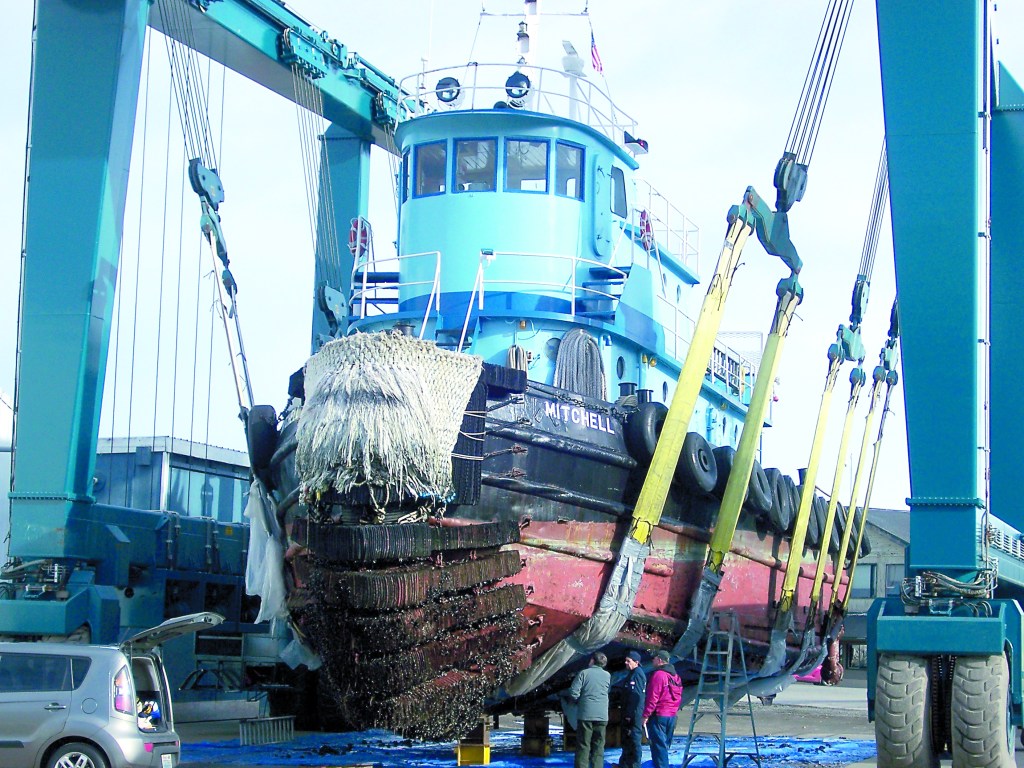 Platypus Marine Inc., the repair company at Marine Drive and Cedar Street in Port Angeles, hauled out the tug Mitchell Hebert, which hung in the slings of the company’s 330-ton Marine TraveLift for about seven hours.