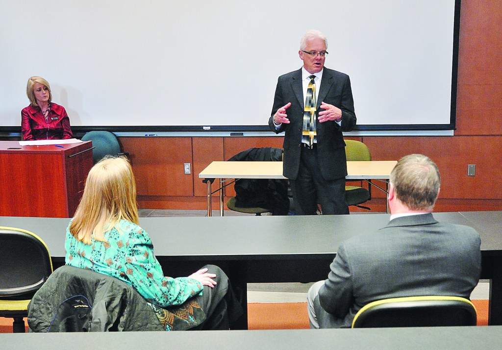 PORT ANGELES — Luke P. Robins, the first of four finalists for president of Peninsula College to visit the North Olympic Peninsula this week, said ongoing cuts to higher education budgets often demand responding with an entrepreneurial approach.