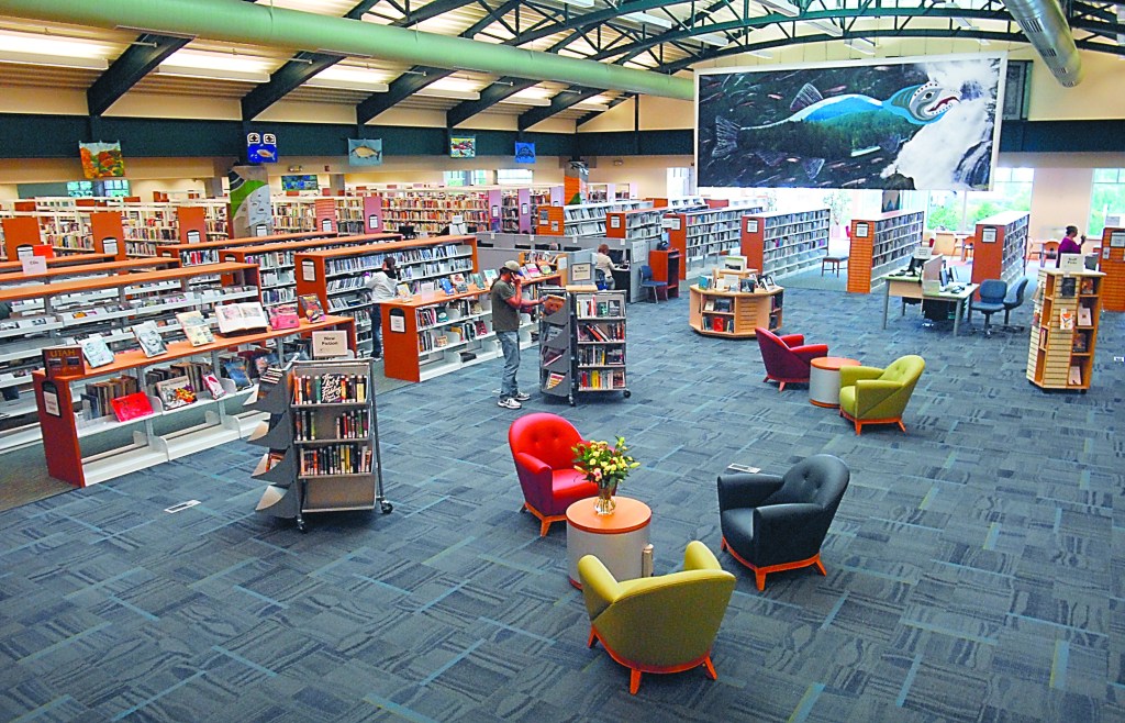In the photo at right, the central hall of the Port Angeles Library receives patrons Tuesday after the area’s reopening following a two-week renovation.