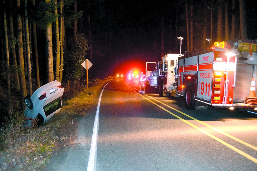 The white Mitsubishi Galant sedan had been traveling east on Cape George Road when it left the road to the south, said Fire Chief Gordon Pomeroy.