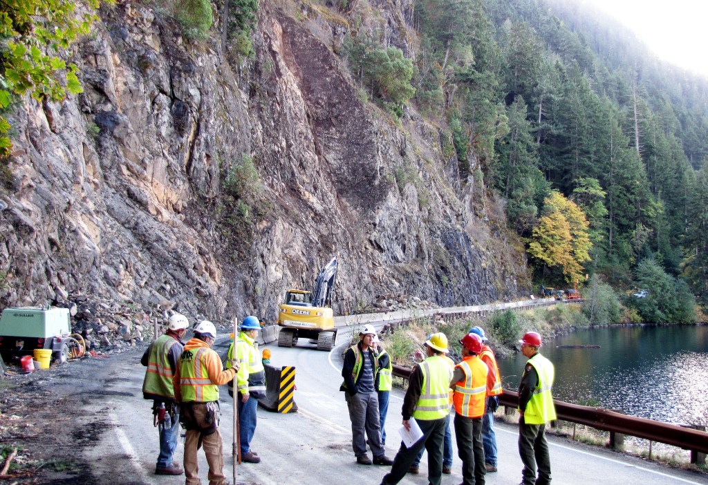 The rockslide occurred at about 12:10 p.m., while construction crews working for the Olympic National Park were scaling loose rock from a hillside at Milepost 228 adjacent to the lake.