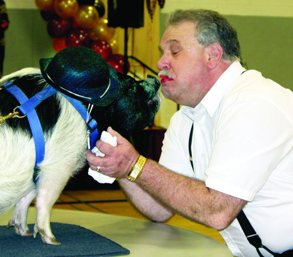 John LeClerc, executive director of Park View Villas retirement community in Port Angeles, on Saturday had to kiss a pig named Winston as the result of successfully fundraising for the Port Angeles Senior Center during the fifth annual Harvest Benefit Dinner at the center. LeClerc’s jar had the most donations in a tongue-in-cheek contest among himself, MIke Jacobs, executive director of Crestwood Convalescent Center, and D Bellamente, the senior center’s director. Nearly $5,000 was raised from the 220 who attended the dinner.