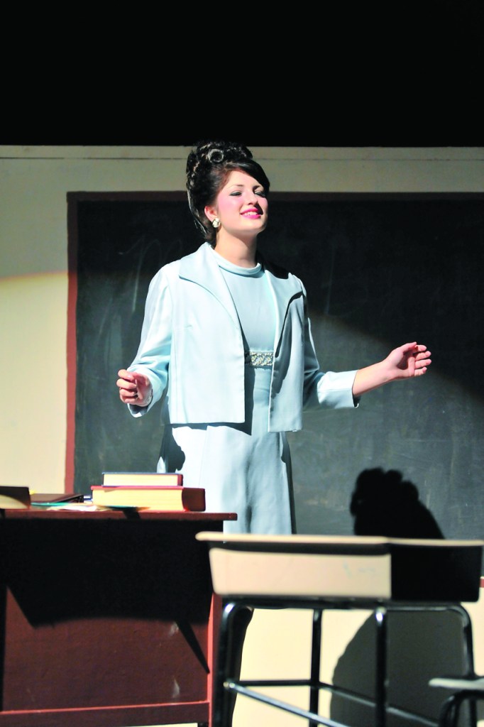 In this play starring Hailey Brock, 18, as an idealistic English teacher, there’s a bright array of students, one very attractive male teacher and the girl with a crush on him. There are notes being passed around and school rules being broken. A student goes up the down staircase, for example, and is disciplined for it.