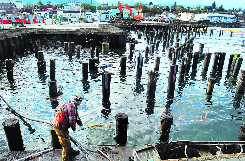 In the accompanying photo, David Gonzales of Seattle-based Manson Construction Co. is shown fishing for stray debris after the decades-old portion of the dock over water was removed this week as part of a $3.5 million project by Black Ball Ferry Lines.