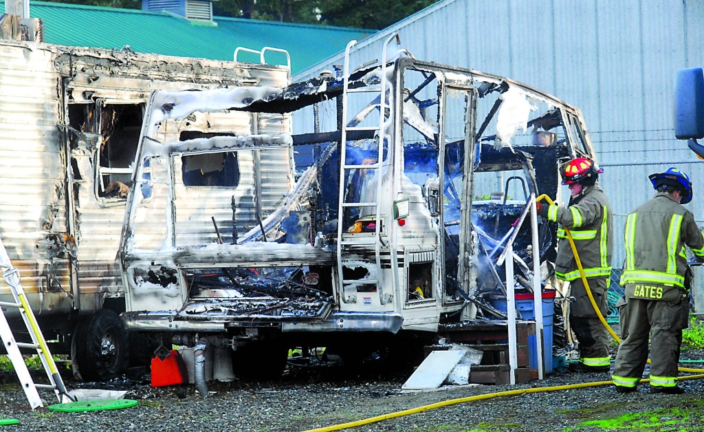 SEQUIM — A recreational vehicle in which a fire department spokesman said two people had been staying in the SunLand community just north of Sequim burned in a Saturday morning fire that damaged two adjacent RVs.
