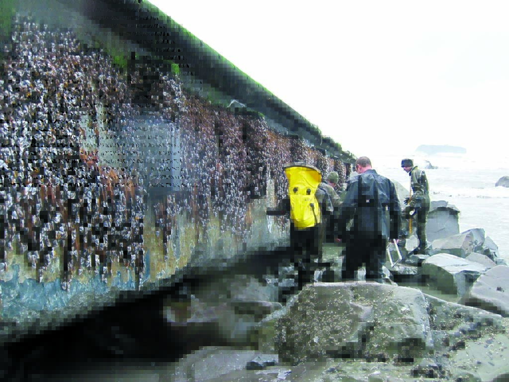 LAPUSH — Researchers are analyzing samples of potentially invasive marine species they took from a 64-foot concrete-and-steel dock that swept ashore on a remote Olympic National Park beach from the 2011 Japanese tsunami.