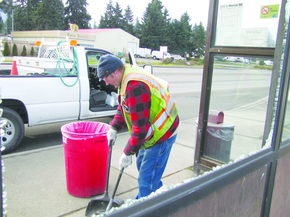 Maintenance workers from Clallam County Transit were busy cleaning up the mess and preparing the shelters for new panes Sunday morning.
