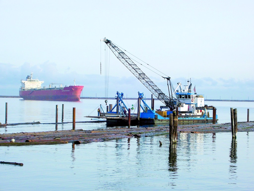 Jesse said upon the completion of that project, the derrick — which has a 42-foot-wide deck — moved over to the Oak Street terminal and replaced two fender piles that were damaged by use late last year.