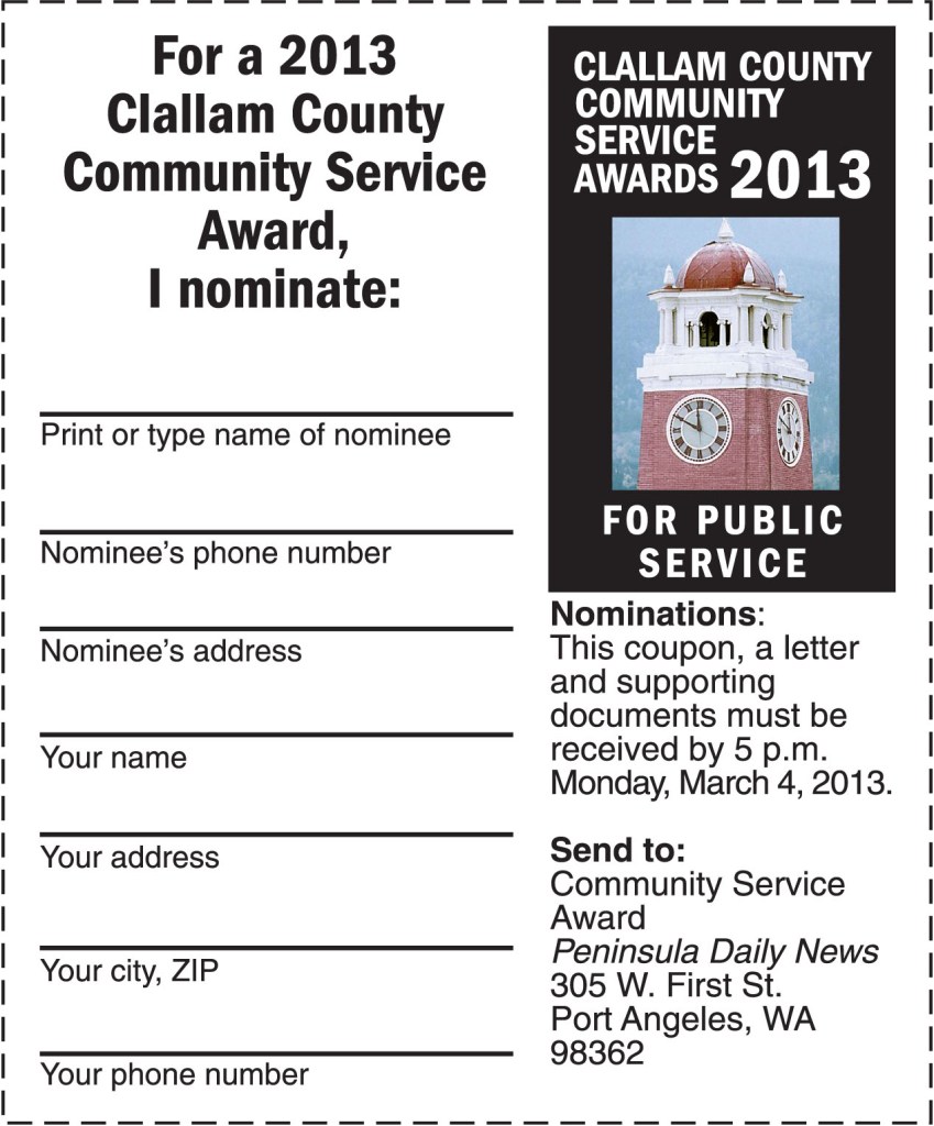 A panel of judges will review the nominations and select one to seven people to receive a Community Service Award at an evening reception in Port Angeles in late April.