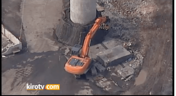 Earlier, an excavator was used to rip off the protective wrapping at the base of the stack, where the explosives were set off at 3:30 p.m. today to no effect.
