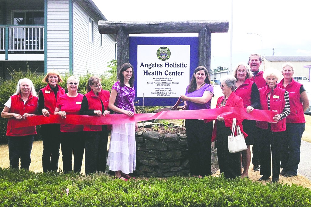 THE PORT ANGELES Ambassadors recently celebrated the grand opening of Angeles Holistic Health Center home of Dragonfly Healing Arts, the practice of licensed massage therapist Kelmie Blake Spires, EEM-AP, with scissors, and of Integrated Healing, the practice of Dr. Christine Rose, EEM-CP, left, at 525 W. Eighth St. in Port Angeles.