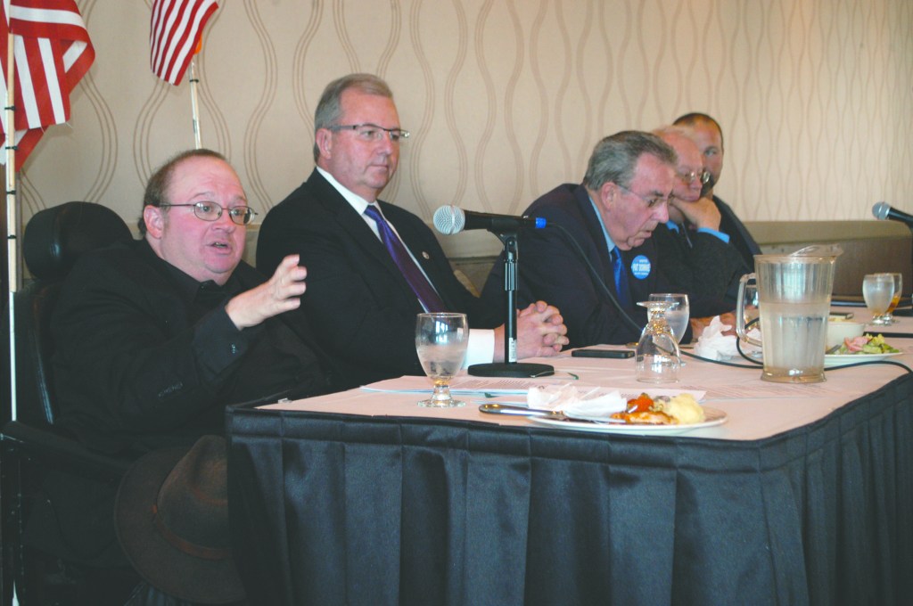 Peter Ripley and Lee Whetham, both candidates for City Council Position 2 formerly held by Max Mania, where joined by current councilmen Brad Collins, Patrick Downie and Dan Gase during the candidate forum.