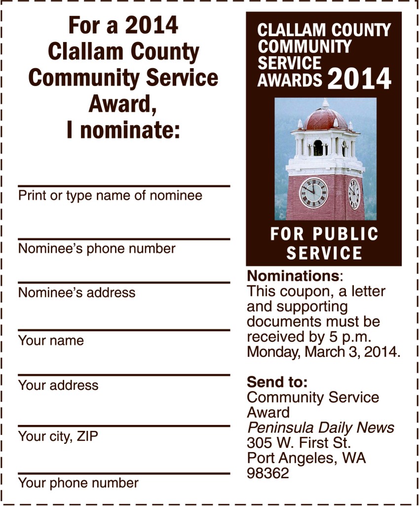A panel of judges will review the nominations and select one to seven people to receive a Community Service Award at an evening reception in Port Angeles in May.