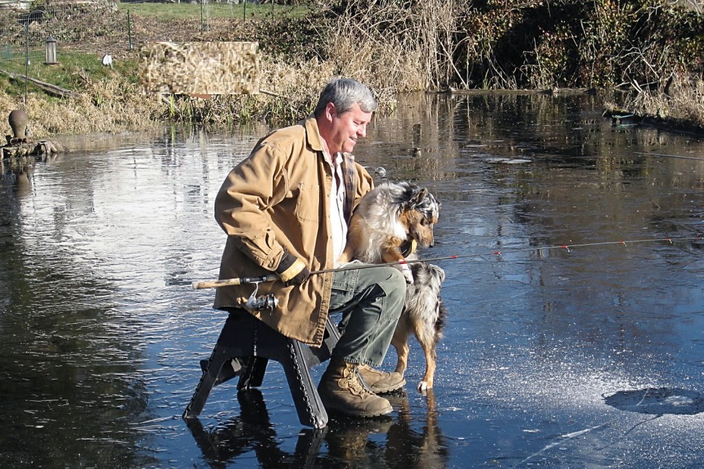 Joe Munn fishes through the ice at Lake Leland. Munn caught three trout fishing from the dock through a hole in the ice.
