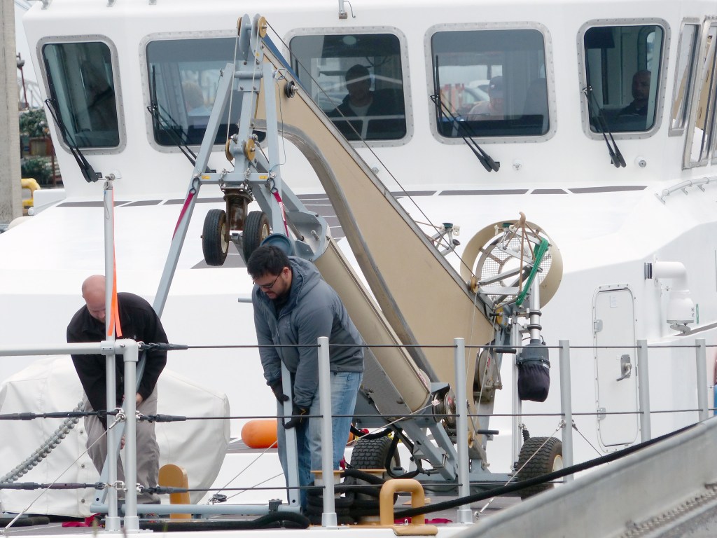 Contract workers install an unmanned-aircraft system aboard Westport Shipyard’s Solution at Port Angeles Boat Haven. —Photo by David G. Sellars/for Peninsula Daily News