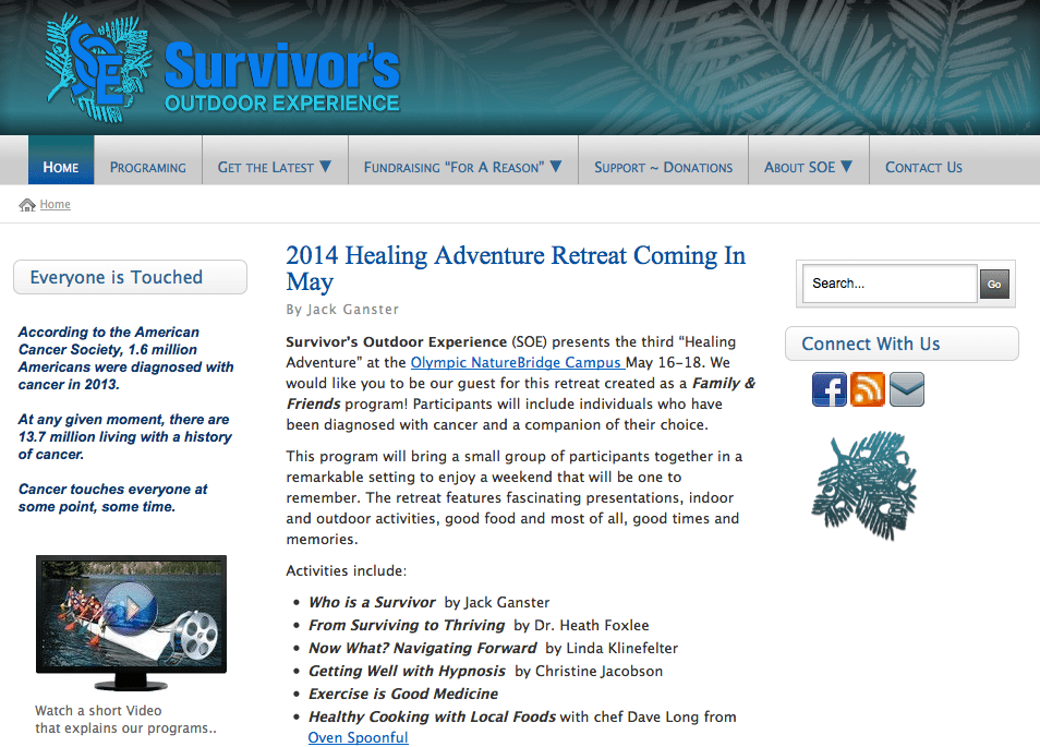 OLYMPIC NATIONAL PARK –– Openings are still available for the 2014 Healing Adventure, a free retreat for cancer survivors sponsored by Survivor’s Outdoor Experience at the Olympic NatureBridge campus May 16-18.