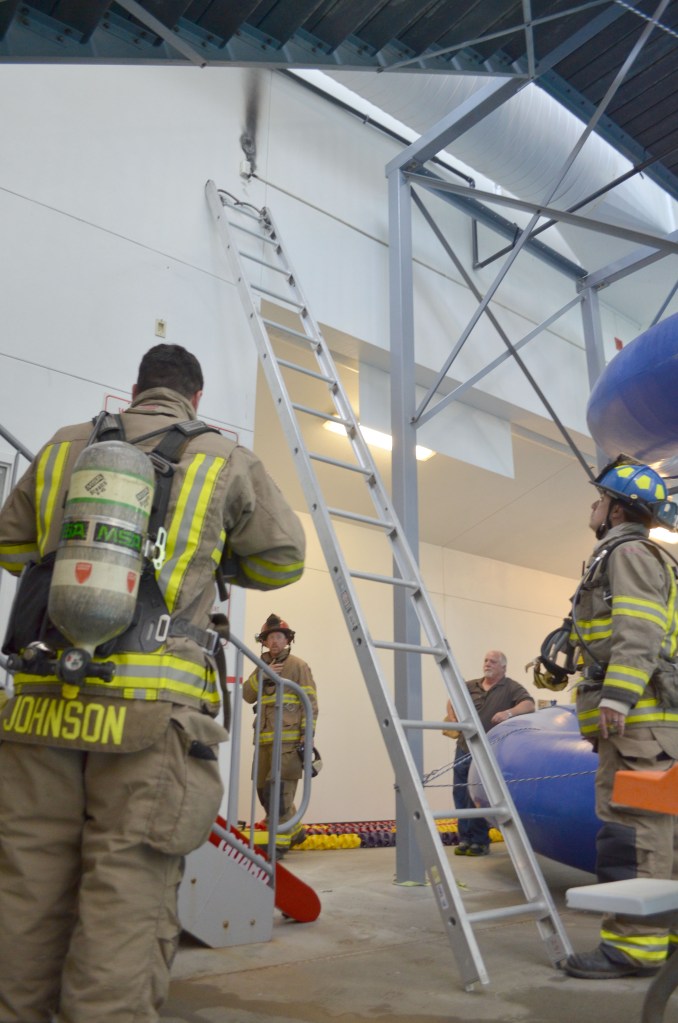 Firefighters with Clallam Fire District No. 3 survey the minor damage caused by a fan fire Monday afternoon at Sequim Aquatic Recreation Center. Patrick Young/Clallam Fire District No. 3