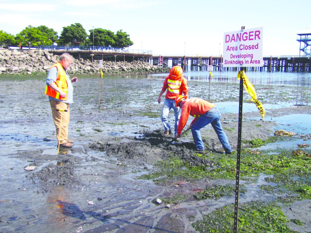 On Thursday, city crews measured the first hole, about 50 feet below usual tide line, at 8 feet wide by 10 feet long and 2 feet deep.