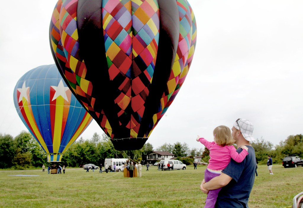 IN THE PHOTO at right, Riley Slater, 2½, points to her favorite for her father, Curtis Slater of Sequim, as two balloons give tethered rides Saturday at the Air Affaire festival at Sequim Valley Airport.
