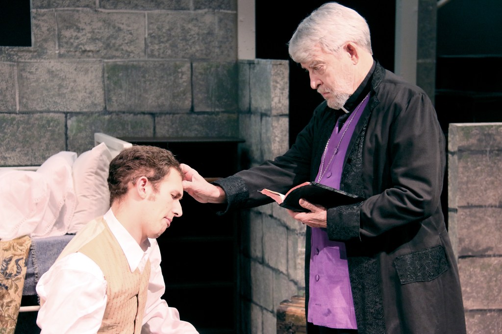 Graham places Peck-Collier center stage for much of the play, with the actor alone in his hospital dungeon. He builds a paper model of the adjacent St. Philip’s Church as street scenes play on around him.