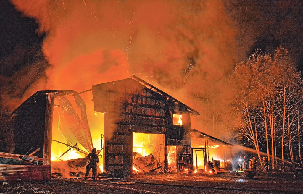 Clallam County Fire District No. 2 responded at 10:10 p.m. to the fire at 836 Little River Road to find the 40-foot-square shop engulfed in flames only 50 feet from Dalton Haubold’s home.