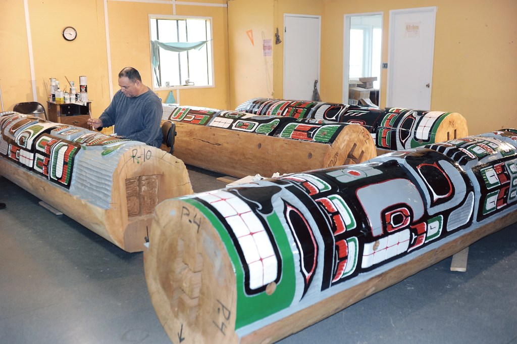 Carvers created totem poles at the teen center that will grace the Be?is Gathering Place at the south end of Hobuck Beach at Famcamp.