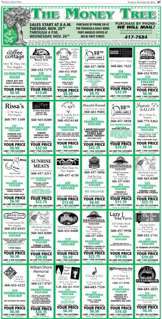 AND . . . YOU HAVE until 4 p.m. today (Wednesday) to grab a bargain from THE MONEY TREE (every Tuesday in the print (and eEdition) Peninsula Daily News.