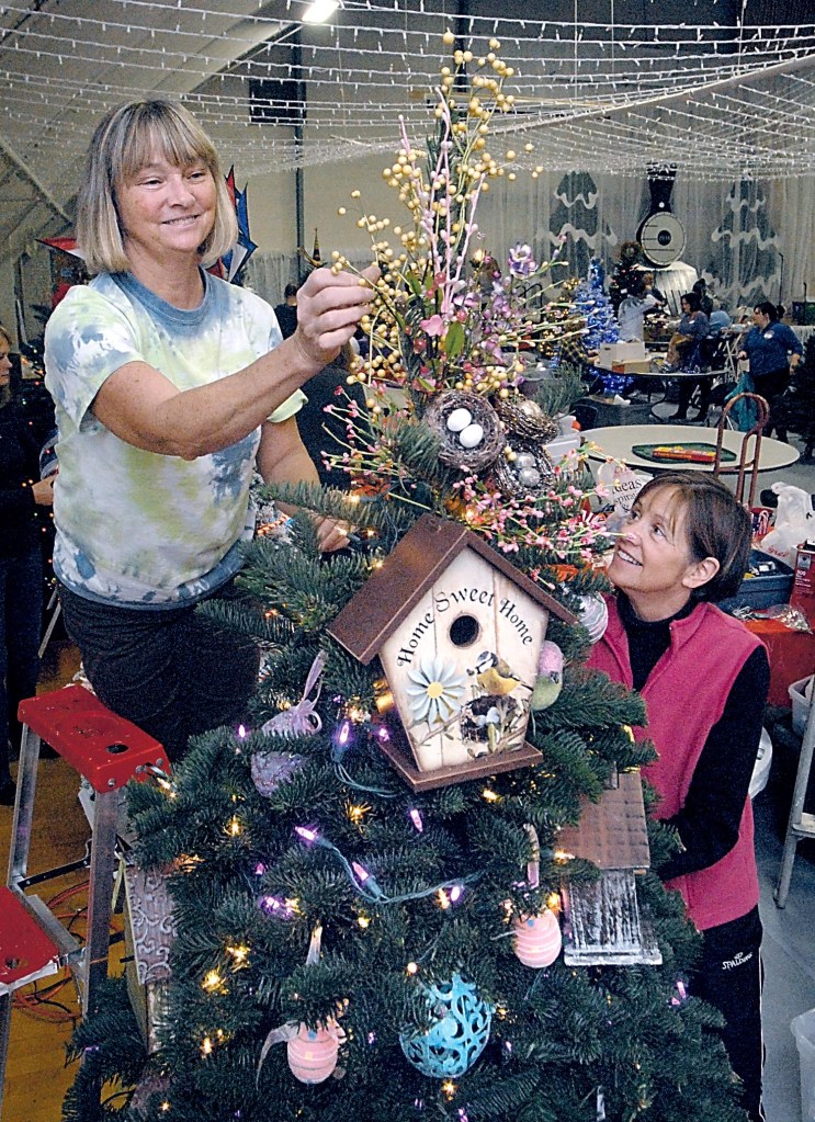 PORT ANGELES — Volunteers on Tuesday began decorating 61 trees, one of which carries a premium of a 1977 Mustang, to be featured during this weekend’s Festival of Trees.