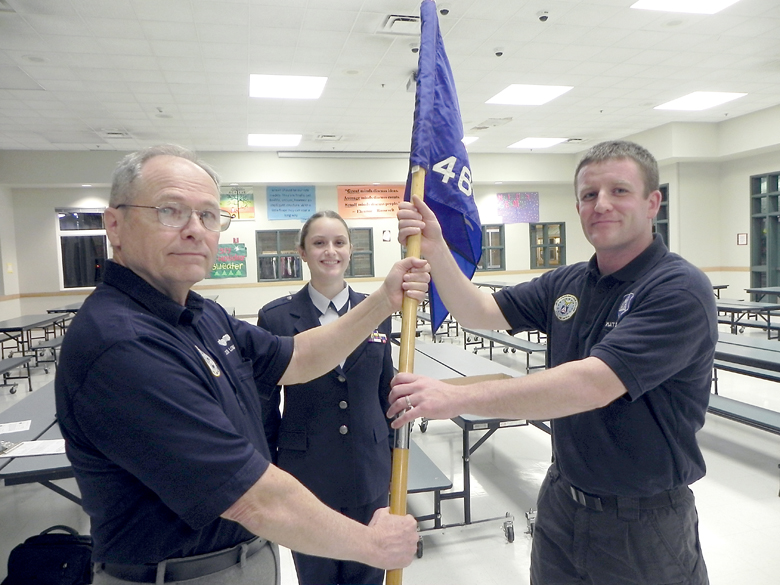 In a change-of-command ceremony Dec. 2 at Sequim Middle School, Lt. Col. Donald Long, commander of Washington Wing’s West Central Group, handed over the squadron flag — a guidon — to 1st Lt. Matthew Stewart.
