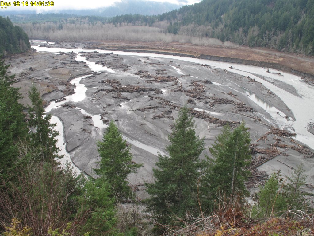 In a set of three storms that drenched the area from Dec. 9 through Dec. 11, about 1.5 million to 2 million cubic yards of sediment were removed from the former Lake Mills and Lake Aldwell lakebeds, and the river uprooted huge swaths of young trees, he said.