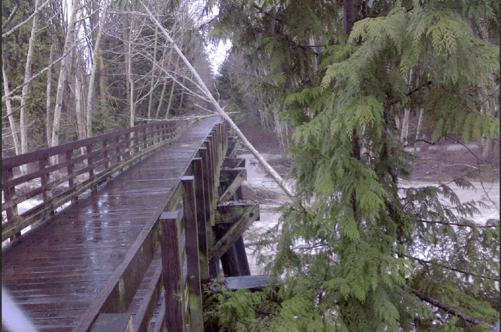 “The bridge at Railroad Bridge Park has been damaged due to high water in the Dungeness River and trees falling on it to the point where it is suspected that collapse [of the western trestle portion] is possible if not probable.