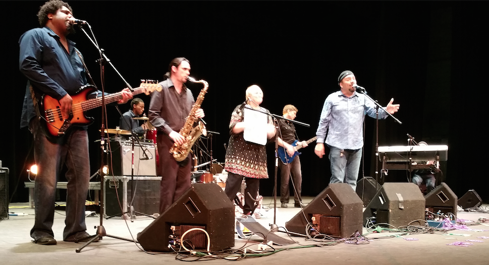 CAROL POPLE (CENTER) played a borrowed frottoir as Terrance Simien (at the mike) and his Zydeco Experience band brought a shot of energy to Port Angeles on Saturday.