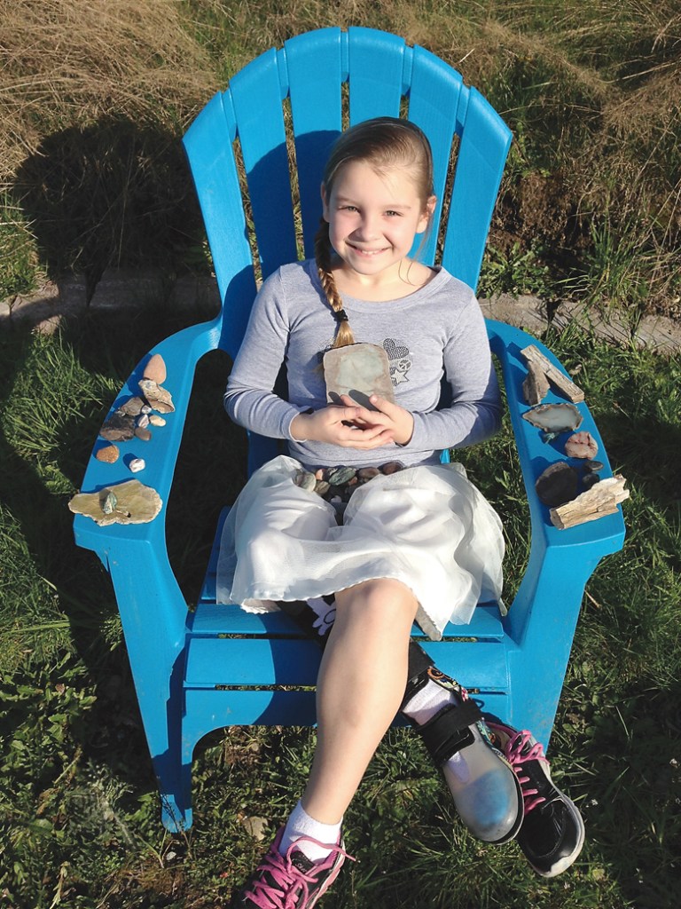 She walks using a “third foot,” a brace for her shortened leg that acts as a prosthetic to match the length of her healthy leg.