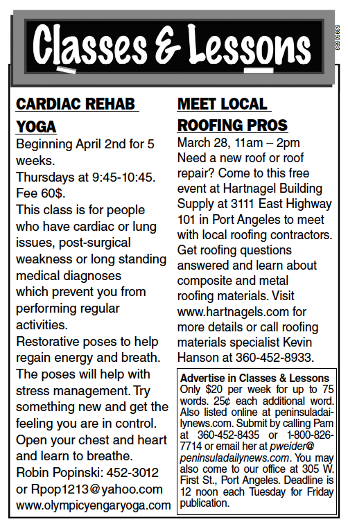 Or email her (subject line: Classes and Lessons) at pweider@peninsuladailynews.com.