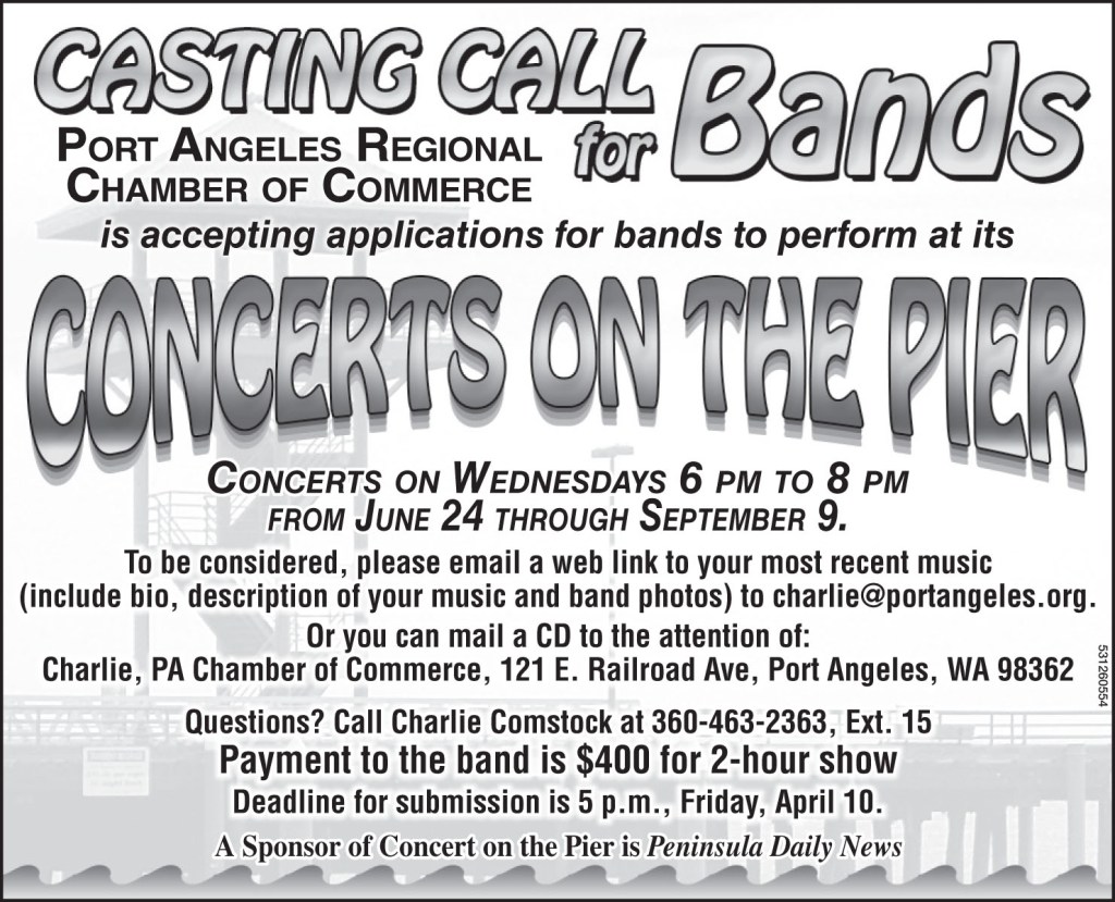 Calling all bands! Deadline for applications for Port Angeles Concert on the Pier is April 10.