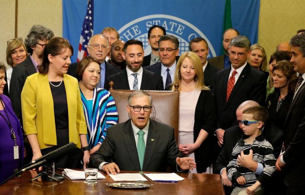 Inslee, who vetoed some minor sections of the bill, was joined during the signing by Ryan Day and his epileptic 6-year-old son, Haiden. Day says the boy’s seizures have been managed with an extracted liquid form of marijuana.