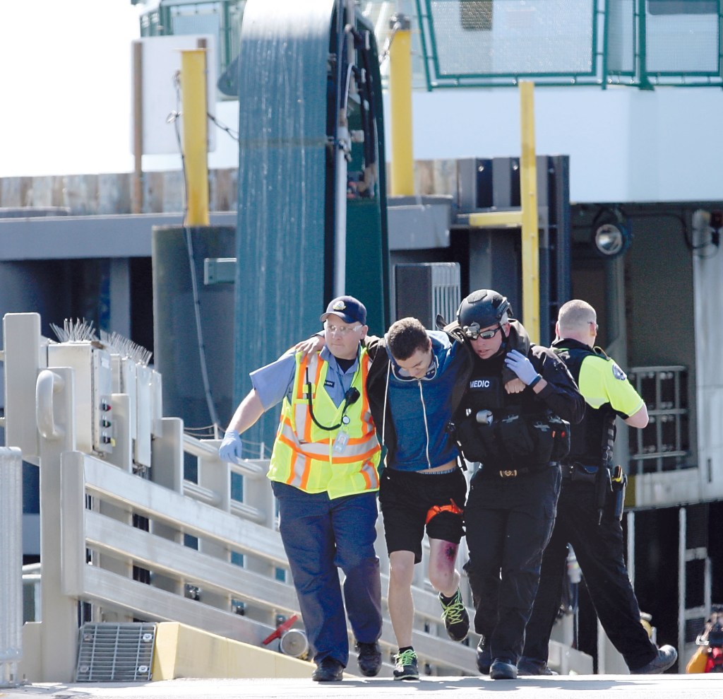 Saturday’s exercise simulated people wounded or panicked by a lone gunman on a ferry who was seeking to shoot or kill as many people as possible.