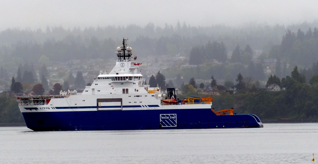 Aiviq soon motored over to Elliott Bay and was anchored off West Seattle’s Harbor Avenue Southwest not far from the rig in the Port of Seattle on Saturday.