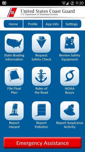 The app also features an emergency-assistance button that will call the closest Coast Guard command center, again if location services are enabled.