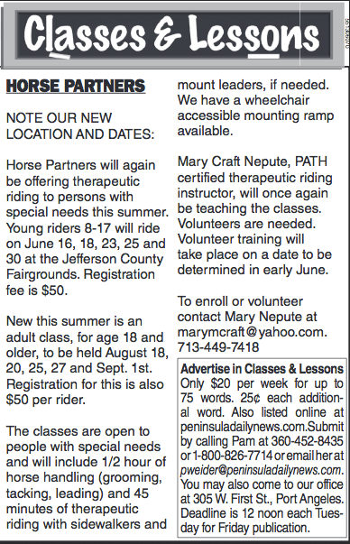 CLASSES AND LESSONS — Horse Partners: Therapeutic riding for persons with special needs