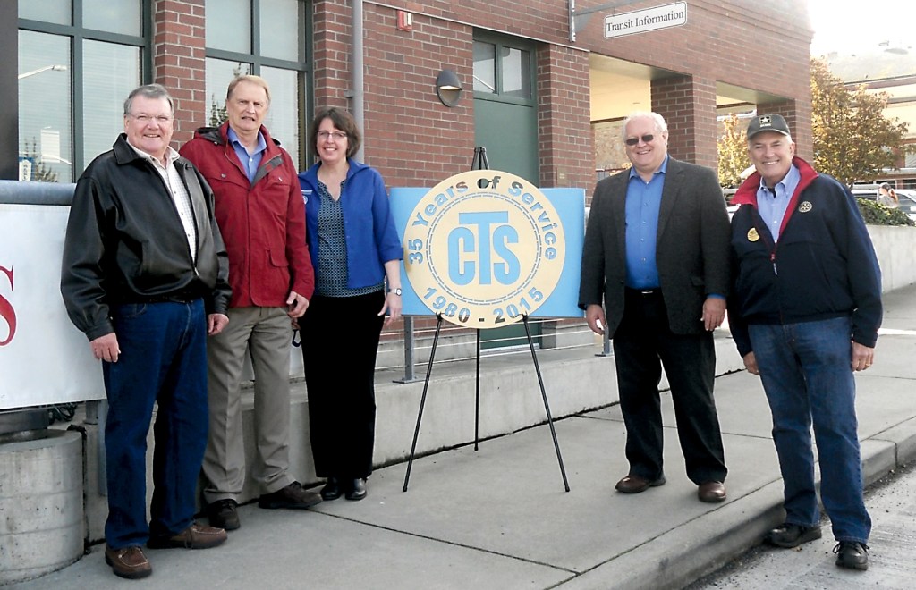Board Vice Chairman Brad Collins joined Clallam Transit General Manager Wendy Clark-Getzin and former general managers Bill Mac Cully, Dan Di Guilio and Terry Weed for the unveiling of the commemorative 1980 bus token.