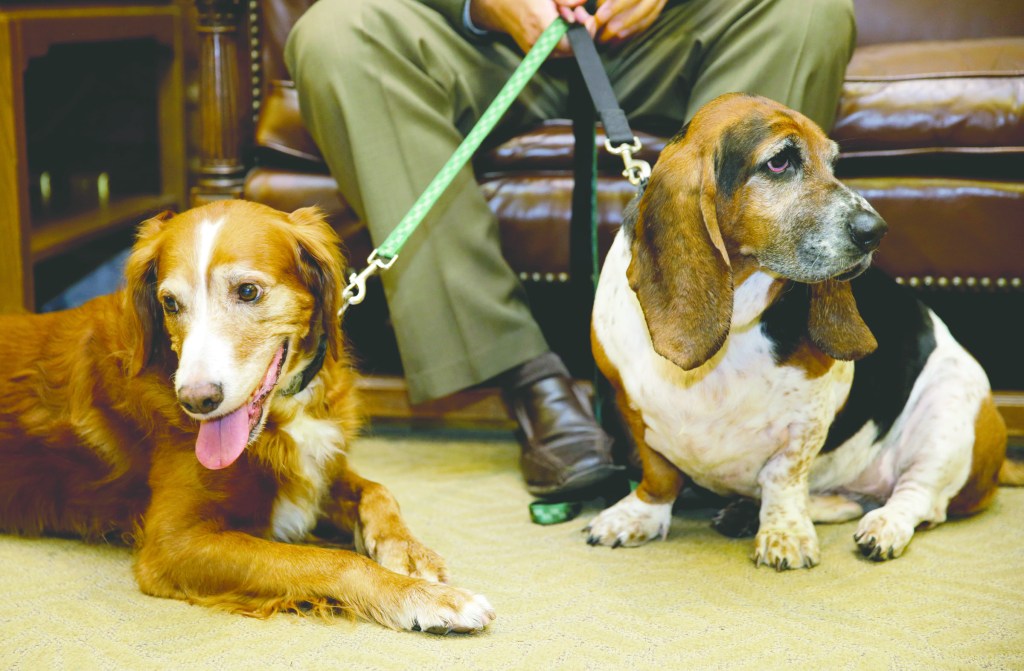 Tillie, a setter-spaniel mix, was joined by her basset hound friend, Phoebe, and owner B.J. Duft as she received a written proclamation and a Washington apple pin on a ribbon that was tied around her neck.