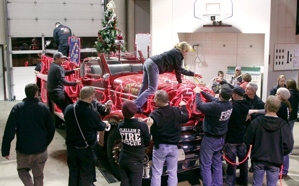 Firefighters spent several hours decorating the department’s antique fire engine Tuesday evening, covering it in lights and adding a tree and a seat for Santa Claus in the back.