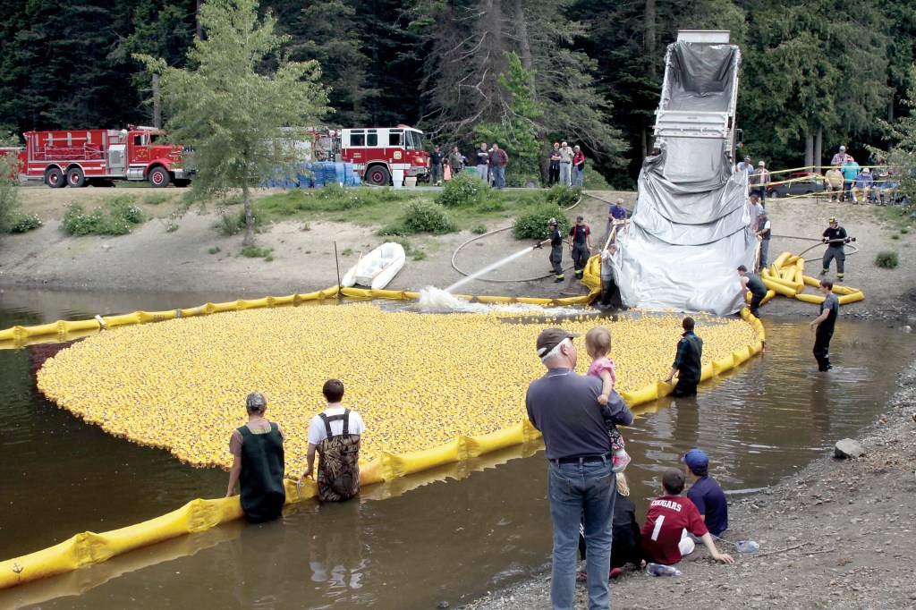 Ducks are dumped into the water, then sent racing across the pond by firehoses — using water from the pond itself — staffed by members of the Port Angeles Fire Department and Clallam County Fire District No. 2.