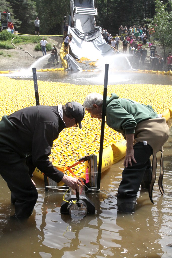 The rush of ducklings were pushed down a chute by streams of water from firehoses operated by firefighters with Port Angeles Fire Department and Clallam County Fire District No. 2.