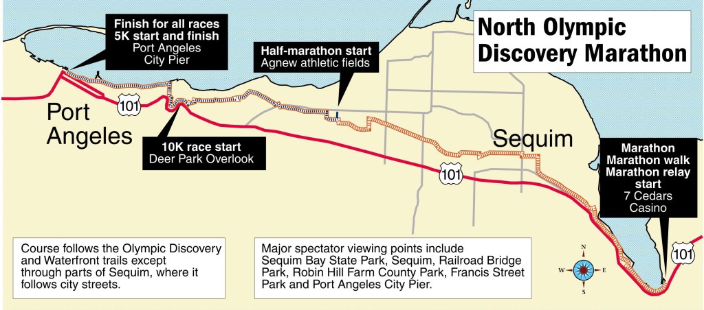 There is a stretch that goes on Sequim streets by Carrie Blake Park, but that stretch does not include Washington Street, as has been the case with past North Olympic Discovery Marathons.