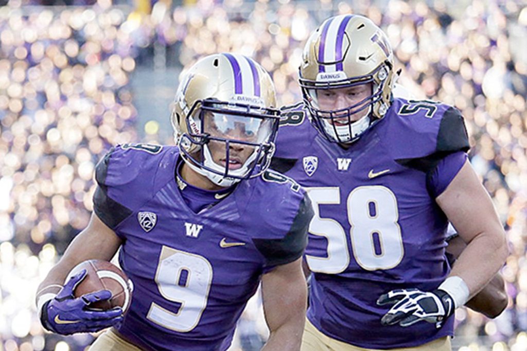 The Associated Press Washington’s Myles Gaskin (9) scores against Washington State as Kaleb McGary follows.